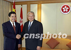 香港行政長官董建華八月十二日歡迎剛抵港履新的外交部駐香港特別行政區特派員楊文昌。中新社圖
