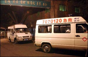 現(xiàn)場到處是救護車、警車、醫(yī)生、救護隊員。由于是國有大礦,一切救護工作都顯得井然有序。井口在一個不大的四方小院里,井口邊緣掛著燈,再往里看時,感覺到黑壓壓的很深。井口正對面的宣傳欄上,寫著“警鐘常鳴”,“實施安全生產(chǎn)法”等字樣。三礦醫(yī)院的副院長穿著白大褂,帶著20幾個醫(yī)護人員守侯在井口,據(jù)說井下還有4、5個醫(yī)護人員。據(jù)悉,到晚上22時,已經(jīng)有4批救護隊員下井勘察。