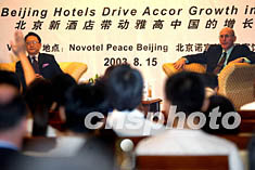法國雅高亞太區(qū)董事行政總經(jīng)理艾森柏(右)十五日在北京宣布,包括中國首家國際經(jīng)濟(jì)性酒店天津宜必思在內(nèi)的九家酒店即將在中國開業(yè)。他表示“非典”并沒有降低中國未來發(fā)展?jié)摿Γ@是拓展中國酒店網(wǎng)絡(luò)最有利的時(shí)刻。中新社記者:鄭萍萍