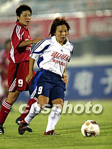 2003中國女足南北明星爭霸賽八月十七日晚在北京先農壇體育場進行,經過八十分鐘的全場較量,最終北方隊憑借韓端的帽子戲法最終以4:1戰勝南方隊獲得本屆中國女足南北明星爭霸賽的冠軍。中新社記者:盛佳鵬