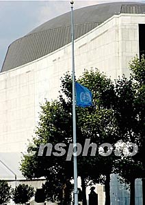 聯(lián)合國(guó)駐巴格達(dá)總部大樓十九日遭炸彈襲擊,二十人在爆炸中喪生,紐約聯(lián)合國(guó)總部隨即降半旗致哀。中新社記者:趙海燕