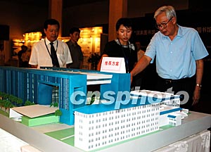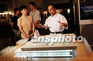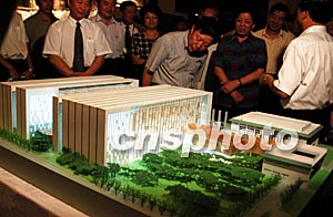 圖為全國人大副委員長蔣正華(右)十九日參觀由德國KSP建筑設計有限公司與華東建筑設計研究院聯合設計的方案,該方案是最后的三個推薦方案之一。中新社記者:王麗南