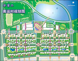 在這個方案中,奧運村布局按雙“喜”字分為四個組團,還設計了聯系奧運村中心區與北部森林公園之間的“景觀通廊”。