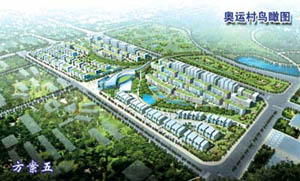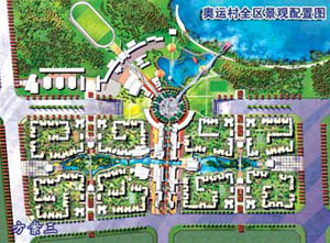 這個設計方案把傳統的中國住宅規劃模式轉化為由奧運五環幻化而成的曲線,圓形升旗廣場象征“龍珠”。