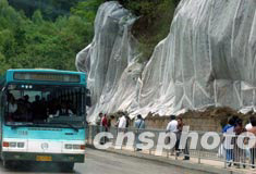 馳名中外的四川省九寨溝風景旅游地今夏正在拓寬綠色環(huán)保觀光車的道路,路邊工作面被蒙上專用材料,一邊遮擋泥石,一邊培育綠草。修路宛如保護環(huán)境的行為藝術(shù)。中新社記者:賈國榮