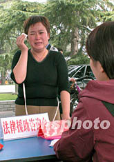 8月31日,鄭州市一位因經(jīng)濟困難而沒有委托訴訟代理人的女性在接受免費的法律服務(wù)。當(dāng)日鄭州市許多法律援助中心走上街頭,宣傳將于9月1日實施的《法律援助條例》,并為求助的人員提供免費的法律幫助。作者:慎重