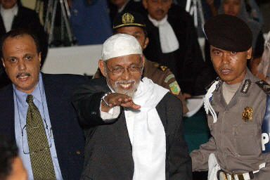 印尼一家法庭9月2日裁定被疑與“基地”組織有牽連的東南亞激進組織“伊斯蘭祈禱團”的精神領袖阿布·巴卡爾·巴希爾(中)參與了叛國行動,并判處他4年監禁。巴希爾不服這個判決結果,表示將上訴。