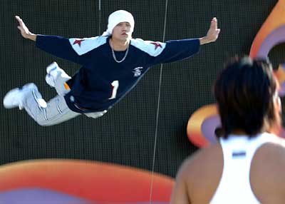 盡管已經(jīng)到了秋高氣爽的天氣,但是昨天下午的太陽依然跟人較勁。工人體育場上,又出現(xiàn)了和上周一樣的場景——一個是已見雛形的景觀歌劇《阿依達(dá)》的巨型金字塔舞臺,另一個就是明天將要在這里上演的周杰倫個人演唱會的豪華舞臺。陽光暴曬下,工作人員正在緊張地忙碌著。舞臺上方,一個籃球架已經(jīng)安置完畢,屆時它將從上方緩緩降落為小天王支起一個臨時的籃球場,周杰倫將為現(xiàn)場觀眾展示高超的球技。記者看到舞臺上有7個快速升降機(jī),到時候周杰倫可以隨時從舞臺的某一個地方“冒”出來,讓觀眾大吃一驚。下午3:00,頭上包著白色毛巾的周杰倫出現(xiàn)在舞臺上,小天王這個打扮讓記者想到了陜西頭戴白羊肚毛巾的農(nóng)民。因?yàn)樵谕頃嫌小皬奶於怠钡娘w行動作,所以主辦方要求他先演習(xí)一下,以保證演出萬無一失。周杰倫在工作人員的幫助下系上安全帶,將鋼絲“拴”在腰間。在倒數(shù)“1、2、3”之后,站在臺階上的周杰倫騰空而起然后緩緩落在舞臺前方。空中的周杰倫動作優(yōu)美干凈利落,贏得周圍一片掌聲。很少有笑模樣的小天王,這時臉上也不由自主地流露出幾許得意。在周杰倫玩“飛人游戲”的過程中,他的兩個壯碩的黑人保鏢就目不轉(zhuǎn)睛地站在舞臺上。(張學(xué)軍)