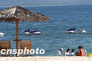 九月,海南三亞的海灘成為游客的樂園,游客不僅可以享受陽光和海風,還可以參加水上摩托等刺激的運動。中新社記者:盛佳鵬