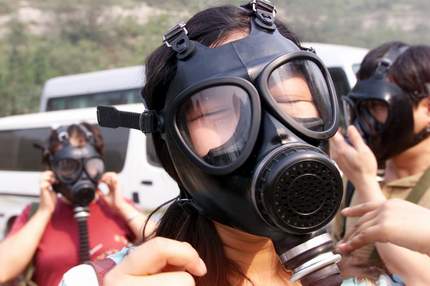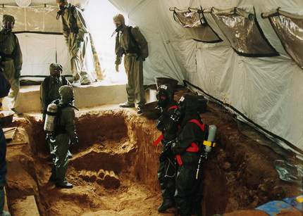 在“中方協助團”防化專家的帶領下,記者穿戴好一整套厚重嚴密的防化服,戴好防毒面具,經過作業保障區,接受過防毒面具氣密性檢測后,進入被稱為“高毒、高爆、高危險”的作業污染區。