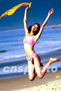 參加第五十三屆世界小姐中國總決賽的選手身著泳裝十八日在三亞亞龍灣進行外景拍攝,一名受過藝術體操訓練的選手做出迷人姿態展翅欲飛。中新社記者:毛建軍