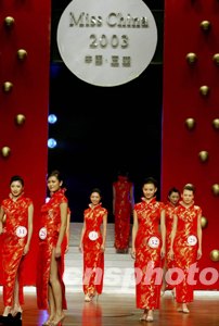 選手們身穿旗袍裝通過紅色宮門向世人演繹中國女性的美麗風韻。中新社記者:毛建軍