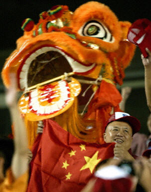 北京時間今天中午,中國隊在本屆女足世界杯的處子戰中1-0力克加納隊。賽后,興奮的中國球迷舞起了獅子,慶祝中國姑娘們的勝利。