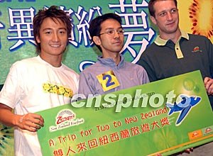 香港歌手方力申,九月二十三日在香港舉行的“ZESPRI奇異黃金夢慶祝會”上主持問答游戲。圖為一名參賽者獲得雙人往返紐西蘭旅游大獎。中新社記者:錢興強