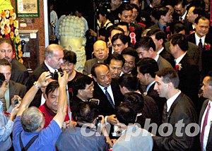 今晚恰逢紐約華人社團聯合總會舉行慶祝中國國慶的晚會,李肇星向僑胞們報告了“非典”之后中國經濟迅速恢復和增長的好消息。他希望華僑華人為促進兩國人民的理解和友誼作出新的貢獻。