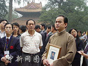 香港曉風學社參禮團的梁崇武先生,手捧父親梁子江先生的遺像參加了祭拜。原來,祖籍香港的梁子江先生,生前對孔子非常崇敬,并在香港創辦了以研究、弘揚祖國書畫、篆刻藝術的“曉風學社”,一直想著要到曲阜孔廟祭拜孔子。后來梁子江先生年齡大了行動不便,最終抱憾而去。今年,梁崇武先生與香港曉風學社的成員邀請了梁子江先生的弟子與生前好友共六十多人前來祭孔。梁崇武先生在大成殿前高舉著父親的遺像說道:“父親,今天我為您實現了遺愿”。