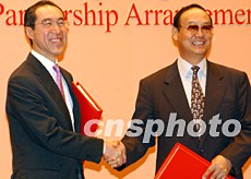 “內地與香港關于建立更緊密經貿關系的安排”附件簽署儀式,九月二十九日在香港舉行,商務部副部長安民和香港財政司司長唐英年,分別代表中央人民政府和香港特別行政區政府,簽署“內地與香港關于建立更緊密經貿關系的安排”附件。中新社記者:錢興強