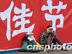中國大陸在今春抗擊“非典”過后又恢復節日長假。圖為北京一名辛勞的女士在采購大批節日商品后,坐于擁擠的市場外小歇。中新社記者:鄒憲
