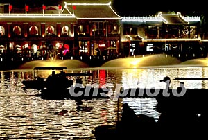 裝點一新的北京什剎海成為“十一”黃金周的新熱點,泛舟在海上的游客陶醉在古色古香的夜景中。中新社記者:鄭萍萍