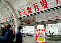 照片和裝置藝術,配上陳舊的機床與剝落的標語,由五十年代舊廠房改建的“798藝術新區”成為北京黃金周的新旅游熱點。中新社記者:鄭萍萍