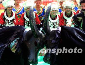貴州省黔東南自治州苗族青年節日期間為游客表演斗牛歌舞,展示當地民族傳統文化,豐富旅游內容。中新社記者:宋吉河