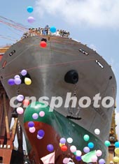 中新社上海十月九日電(記者褚婷婷)為適應運輸輕軌列車等大型設備的需要,載重三萬噸的多用途重吊貨輪——“中波明月”號,今天中午在上海船廠二號船臺下水。據悉,這種貨輪是當今世界件貨航運市場上最先進、規模最大的運輸工具,它的建成及不久后的投入營運,將有力提升中國在世界雜貨運輸航線上的競爭力。