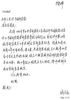 錢學(xué)森1955年回國,1957年被增選為中國科學(xué)院學(xué)部委員(1994年改稱中國科學(xué)院院士)。錢老當(dāng)然十分珍視中國科學(xué)界給他的這一榮譽(yù),并積極參加中國科學(xué)院學(xué)部委員的各種學(xué)術(shù)活動。但到晚年,當(dāng)他行走困難,不便參加學(xué)術(shù)活動以后,便給當(dāng)時(shí)的中國科學(xué)院院長周光召寫信,主動申請辭去學(xué)部委員的稱號(錢老給周光召的信附后)。
