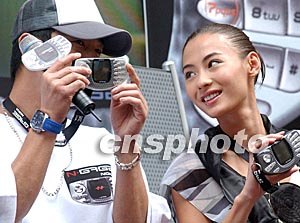 香港明星陳小春、張柏芝,周日一同亮相時代廣場,為諾基亞首部手提游戲手機作推廣活動,張柏芝站在陳小春身后不停笑他十分投入的姿態(tài)。中新社記者:錢興強
