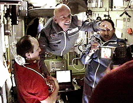 2001年4月30日,第一位太空游客、美國人蒂托(中)快樂地進入國際空間站,開始了他為期一周的太空觀光生活。太空旅游的開辟使得普通人也能夠像宇航員一樣暢游星際之間。新華社圖