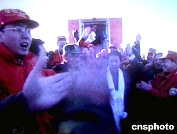 楊利偉十六日清晨走下檢查車,身披蒙古姑娘敬獻的哈達,在眾人的歡呼聲中簇擁著登上飛向北京的專用直升機。中新社記者:賈國榮