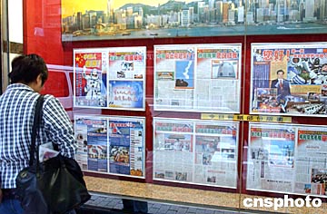 十月十六日晨,中國首次載人航天飛行圓滿成功,航天員楊利偉順利返航,圖為香港市民在《大公報》報窗前及時觀看當日新聞。中新社記者:錢興強