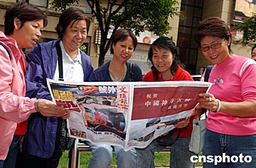 十月十六日清晨,香港市民關注神舟五號飛船凱旋消息,圖為一群婦女爭賭此間一媒體號外。中新社記者:潘索菲