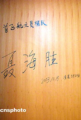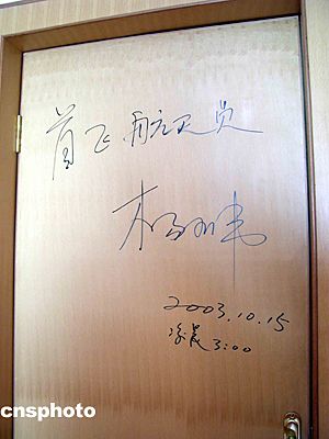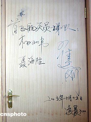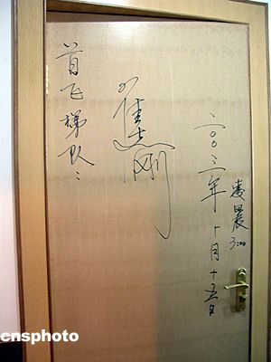 二00三年十月十五日凌晨,中國飛天第一人楊利偉及首飛梯隊航天員于“神舟”五號載人飛船發射前,在酒泉衛星發射中心航天員公寓“問天閣”的住房房門上簽名留念。中新社記者 孫自法 攝影報道