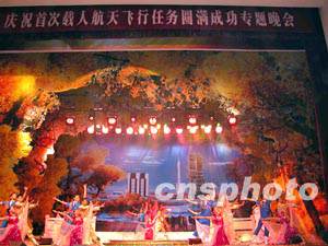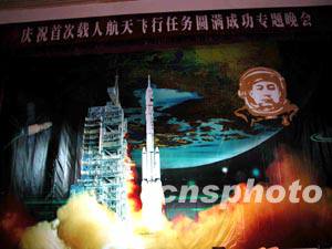 十月十六日晚,中國酒泉衛星發射中心舉行專題晚會,慶祝中國首次載人飛行圓滿成功。中心的科技人員和部隊官兵載歌載舞,歡慶“神舟”五號飛船成功發射和中國首位航天員順利返回。