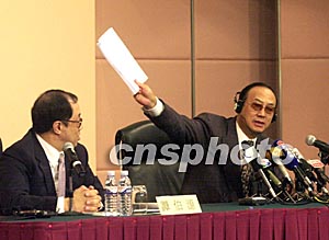 “內地與澳門關于建立更緊密經貿關系的安排”今天下午在澳門特區政府總部簽署。簽署儀式后,兩位簽署人安民和澳門經濟財政司司長譚伯源在澳門世貿中心舉行新聞發布會,向媒體介紹有關情況。