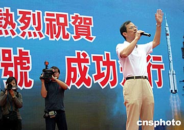 香港逾五千名來自十多個團體的市民,十九日在中環遮打花園巡游,慶祝神舟五號成功載人上太空。圖為民建聯主席曾鈺成在臺上發言。作者:譚達明