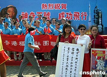 由香港民建聯等多個團體組成的籌委會,十九日上午舉行祝賀中國首次載人飛船上太空成功大巡游活動,約五千名市民參加,氣氛熱烈。作者:譚達明