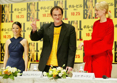 10月19日,美國導演昆汀·塔倫蒂諾(中)、好萊塢著名影星烏瑪·瑟曼(右)和劉玉玲在日本東京出席最新動作片《殺死比爾》的新聞發布會。該片由塔倫蒂諾執導,瑟曼、劉玉玲主演,將于10月25日在日本公映。