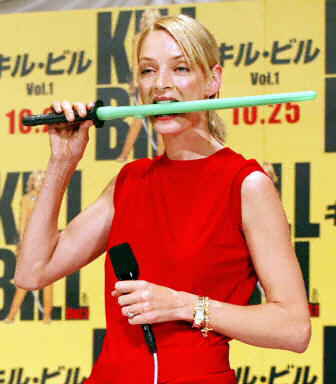 好萊塢著名影星烏瑪·瑟曼19日在日本東京出席由她主演的最新動作片《殺死比爾》的新聞發布會。