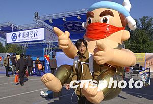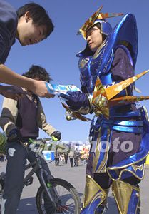 來(lái)自韓國(guó)、日本等地的互聯(lián)網(wǎng)游戲提供商與中國(guó)網(wǎng)絡(luò)游戲企業(yè)擺開(kāi)陣勢(shì),“一決高下”。圖為網(wǎng)絡(luò)游戲人物向參觀者派發(fā)產(chǎn)品資料。中新社記者:張煒