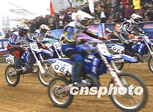 2003年“嘉陵杯”全國越野摩托車總決賽24日在重慶嘉陵賽車場拉開戰幕,來自全國21支隊伍120多名運動員參賽,為爭取全年的總排名爭奪異常激烈。中新社記者:趙振清