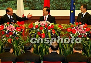 中歐領(lǐng)導(dǎo)人第六次會(huì)談三十日在北京舉行。會(huì)談結(jié)束后,中國(guó)國(guó)務(wù)院總理溫家寶、歐洲理事會(huì)主席意大利總理貝盧斯科尼(左)、歐盟委員會(huì)主席普羅迪(右)共同回答中外記者提問。鄭萍萍 攝