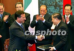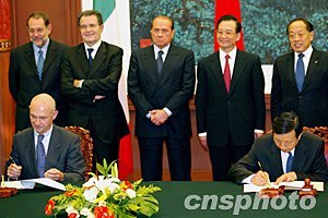 中國(guó)與歐盟三十日在北京簽署伽利略衛(wèi)星導(dǎo)航合作協(xié)定等三個(gè)文件。中國(guó)國(guó)務(wù)院總理溫家寶、歐洲理事會(huì)主席意大利總理貝盧斯科尼(后左三)、歐盟委員會(huì)主席普羅迪(后左二)、歐盟共同外交與安全政策高級(jí)代表索拉納(后左一)共同出席簽字儀式。鄭萍萍 攝
