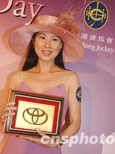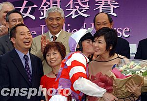 香港婦女銀袋賽十一月二日在沙田馬場舉行,獲得該賽頭馬的騎師親吻影星關(guān)之琳。中新社記者:潘索菲