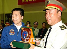 圖為在歡迎儀式上司令員王繼堂代表駐港部隊向楊利偉贈送紀念品。