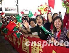 中國(guó)載人航天飛行代表團(tuán)團(tuán)長(zhǎng)胡世祥、副團(tuán)長(zhǎng)張慶偉及航天員楊利偉一行在港澳碼頭受到了澳門各界人士的熱烈歡迎,中央駐澳聯(lián)絡(luò)辦主任白志健以及澳門特區(qū)政府代表、運(yùn)輸工務(wù)司司長(zhǎng)歐文龍等到碼頭迎接。近千名澳門中小學(xué)生和各大社團(tuán)代表,打著橫幅、揮舞國(guó)旗和澳門區(qū)旗,夾道歡迎航天英雄的到來。當(dāng)楊利偉一行步出碼頭出境大廳時(shí),人群中爆發(fā)出一陣陣歡呼聲。四名小學(xué)生向胡世祥、張慶偉、楊利偉和總設(shè)計(jì)師王永志獻(xiàn)花,楊利偉等向歡迎人群揮手致意,并不時(shí)同人們握手,感謝澳門同胞的盛情。