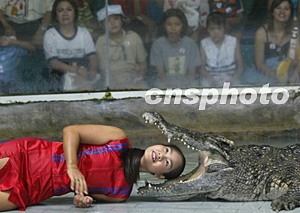 聞名泰國的是拉差公園已成為外國游人的必到之處,周末,美女與鱷魚共同演出時(shí)的親近之舉令人心驚。中新社記者:趙振清