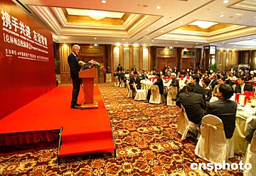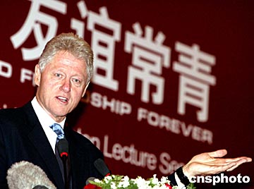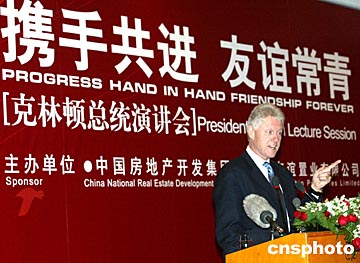 美國前總統克林頓十一月十一日在北京國際俱樂部飯店出席演講會,向中外人士宣講中美攜手共進,友誼常青。