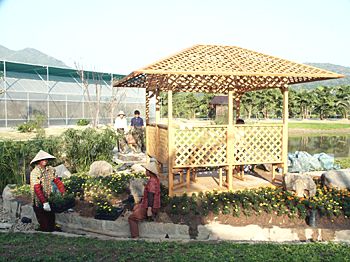 花博會期間,各種文化大餐精美絕倫,豐富多彩,將讓四海賓朋在四季如春的花博園盡情品味漳州深厚的歷史底蘊和人文風俗。圖為建設中的園藝小品。蔡文原 攝