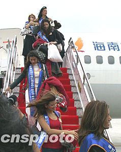 世界小姐參賽佳麗陸續走下舷梯。關向東 攝